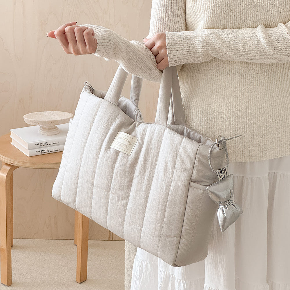 포근한 패딩 소재와 은은한 펄 컬러가 더해져 겨울철이나 간절기에 특히 고급스러운 무드를 자아냅니다. 토트백 스타일이지만 수납력이 뛰어나 데일리백으로도 손색이 없는 제품이죠. 출산 선물로도 인기가 많을 만큼 감각적인 디자인이 큰 장점입니다.